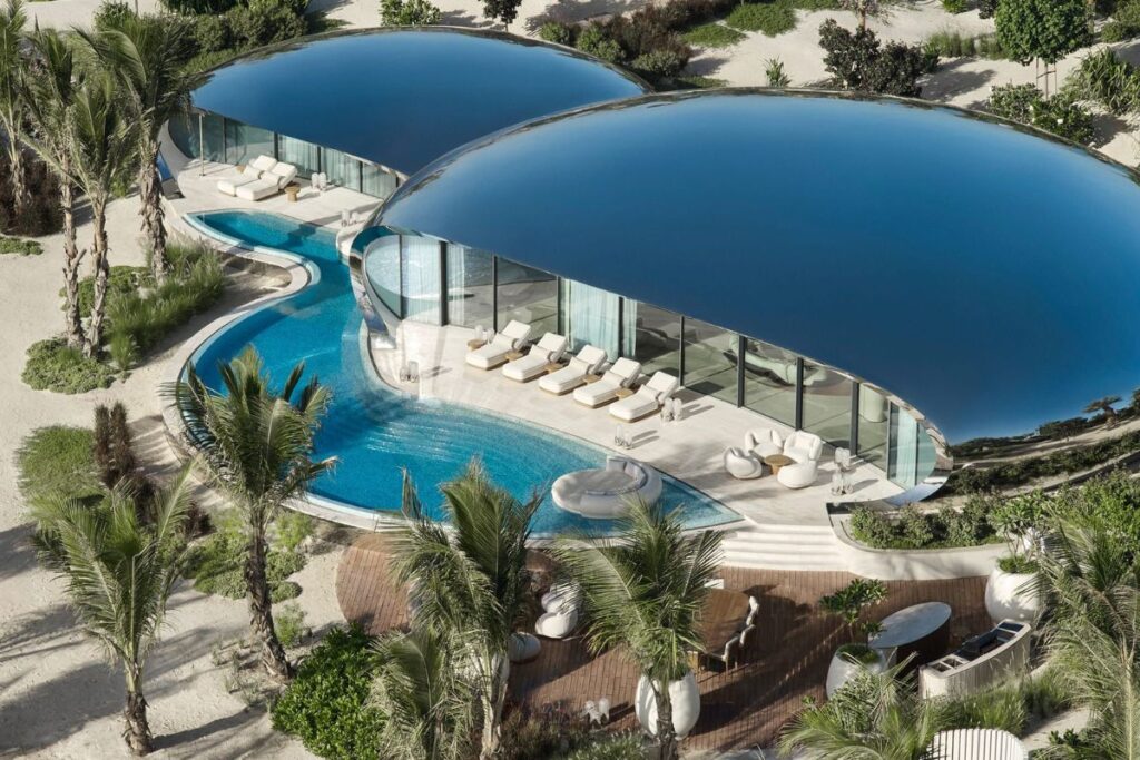 Οι αστραφτερές «σφαίρες» είχαν προκατασκευαστεί και εξοπλισθεί πλήρως στα Ηνωμένα Αραβικά Εμιράτα και κατόπιν μεταφέρθηκαν στο σημείο και τοποθετήθηκαν επάνω σε τσιμεντένιες βάσεις με μεταλλικά πέδιλα αγκυρωμένα στον βυθό και στην ακτογραμμή. Με αυτόν τον τρόπο ελαχιστοποιήθηκαν οι επεμβατικές εργασίες που θα είχαν αρνητική επίδραση στο ευαίσθητο οικοσύστημα του νησιού. Είναι σαν να δημιούργησε κάποιος 73 super-yachts, γιατί αρχιτεκτονικά υπάρχουν πολλά κοινά στοιχεία με τα πολυτελή σκάφη.